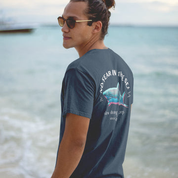 Nunca hemos podido encontrar camisetas de tiburones que muestren por un lado la paz y serenidad que representan los tiburones ballena, ni asociados a destinos de buceo donde son las estrellas como en Isla del Coco ni diseños que nos acercasen la sensación de miedo, emoción y fascinación que supone el buceo con tiburones blancos.